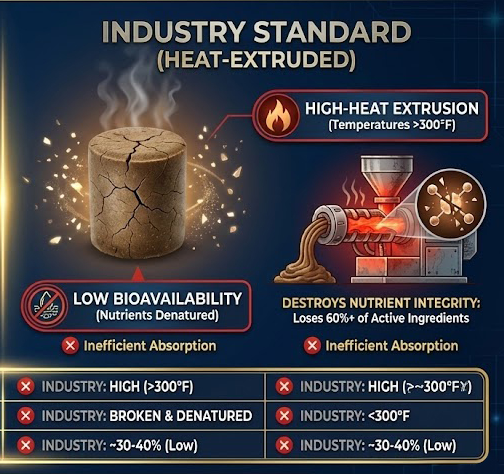 Standard supplements lose up to 70% of bio-activity during processing. If you aren't using Cold-Press technology, you're just paying for expensive waste.